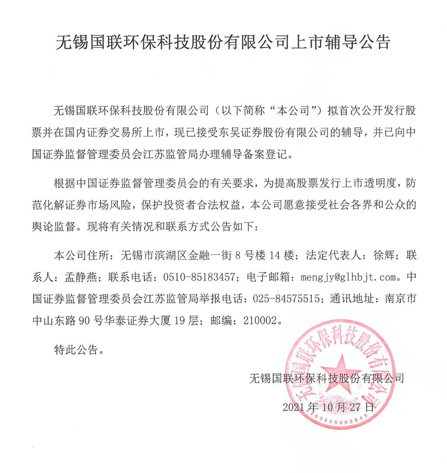 無錫國聯環(huán)保科技股份有限公司上市輔導公告